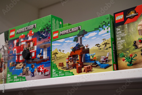 © Erman Gunes, Obraz premium Lego Minecraft series boxes on store shelf. Toronto, Canada - September 24, 2025.