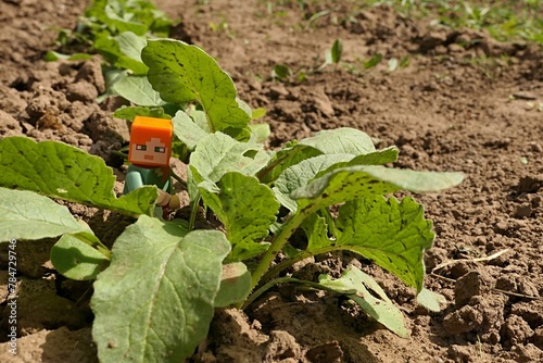 Naklejka premium LEGO Minecraft small figure of Alex hidden in garden between spring leaves of Radish vegetable, latin name Raphanus Sativus. Spring daylight sunshine.