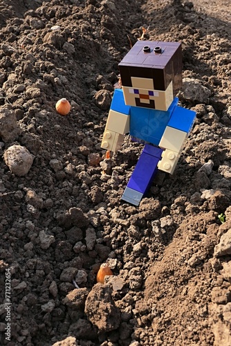 © zayacsk, Naklejka premium LEGO Minecraft smiling figure of Steve checking planted onion nurselings in garden seed bed, spring daylight sunshine