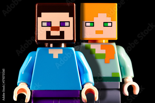 © Klochkov, Obraz premium LEGO Minecraft Steve and Alex standing on the black background