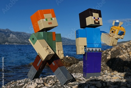 © zayacsk, Naklejka premium LEGO Minecraft Steve examining LEGO Pufferfishes aquatic mobs, Alex walks next to him. Location rocky Croatian beach, bay water and Velebit mountain in background. Blue summer skies.