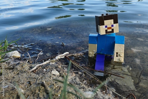 Naklejka premium LEGO Minecraft Steve walking out of shallow water of large spring fish pond,...