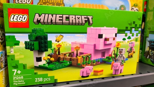 © Kateryna Shyntiapko, Obraz premium LEGO Minecraft "The Baby Pig House" set on shelf | Blocky aesthetic with pigs & bee | Concept of gaming toys, licensed products, retail editorial