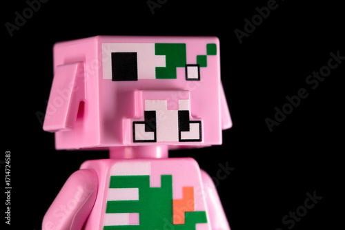 © Klochkov, Obraz premium LEGO Minecraft Zombie Piglin rotated face close-up on a black background