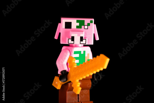 © Klochkov, Naklejka premium LEGO Minecraft Zombie Piglin with a golden sword on a black background