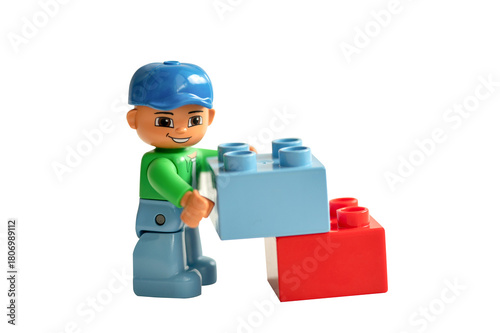 © Юлия Васильева, Naklejka premium Lego minifigure holds toy blocks isolated on a white background.