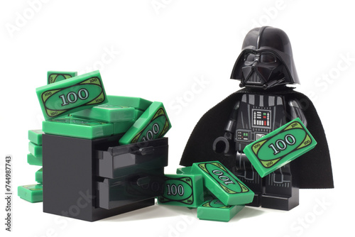 © igradesign, Naklejka premium Lego minifigure of Darth Vader or Star Wars male is counting his money green banknotes isolated on white. Editorial illustrative image of finance and banking.