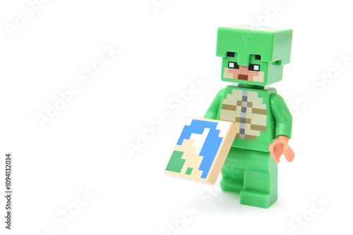 Naklejka premium Lego minifigure of popular game Minecraft with pixel map isolated on white. Editorial illustrative image of popular plastic toys.