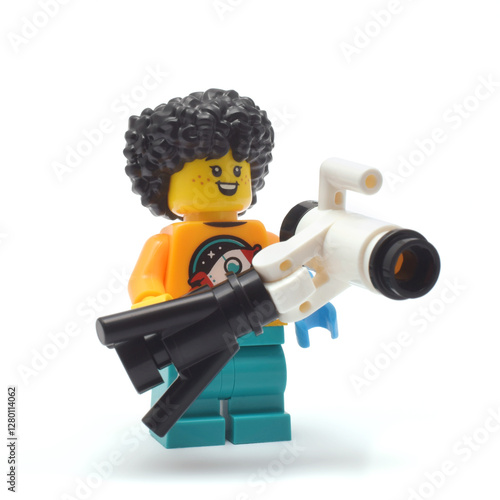 Naklejka premium Lego minifigure of smily astronomer with telescope isolated on white. Editorial illustrative image of collectable toys of edition 27.