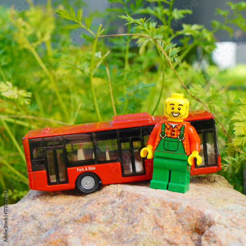 © Everyday Frame, Naklejka premium Lego minifigure with a red bus on a rock in front of green foliage