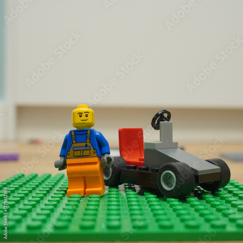 © Everyday Frame, Naklejka premium Lego minifigure with a small race car on a green baseplate