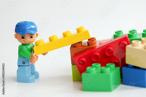 © Юлия Васильева, Naklejka premium Lego minifigure with colorful building blocks on white background. Lego is extremely popular worldwide with children and collectors.