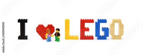 © igradesign, Obraz premium Lego minifigures are staying before a message "I love lego" are builded from bricks. Editorial illustrative image of popular plastic toy constructor.