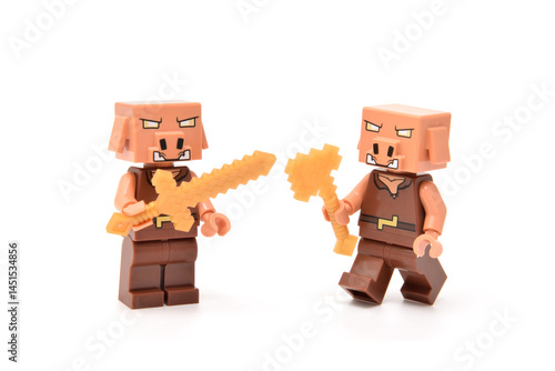 © igradesign, Fototapeta premium Lego minifigures of angry pigs from video game Minecraft movie are fighting with weapons or swords. Editorial illustrative image of popular plastic toys.