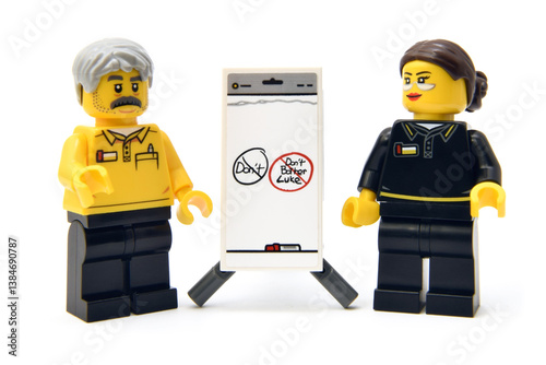 Naklejka premium Lego minifigures of employee or college with presentation of new American fees. Editorial illustrative image of popular plastic toy constructor.