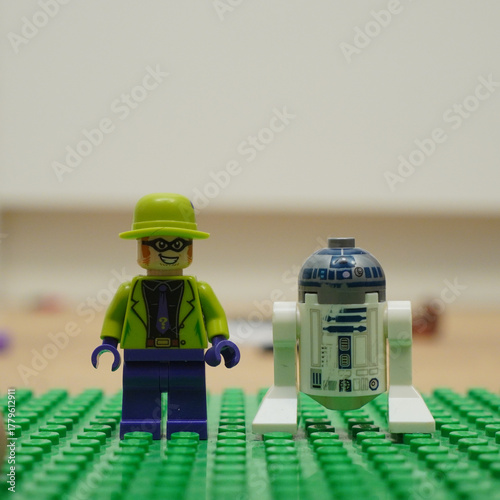 © Everyday Frame, Naklejka premium Lego Riddler and R2-D2 Minifigures on a Green Baseplate