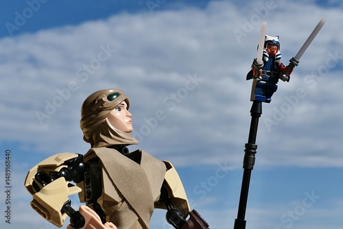 © zayacsk, Fototapeta premium LEGO Star Wars action figure of female Jedi Rey Skywalker looking at small figure of female Togruta Jedi Ahsoka Tano with two lightsabers on tip of her pole. Cloudy skies background.