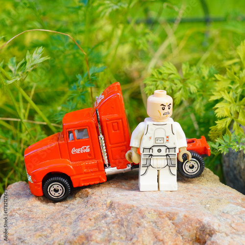 © Everyday Frame, Naklejka premium Lego Star Wars figure stands beside a red Coca-Cola truck on a rock