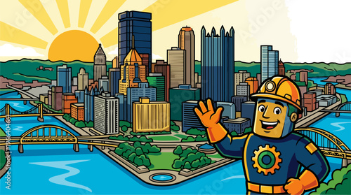 © Indra, Obraz premium Lego worker cityscape background.