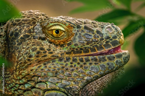Fototapeta premium Leguan Portrait Gesicht mit gelben Augen und Mund. Echse Reptilien...