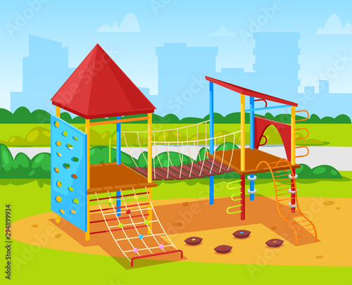 © robu_s, Naklejka premium Leisure and activity for kids, and for children in city park. Cityscape with skyscrapers and igh buildings, construction with ropes and challenges. Vector illustration in flat cartoon style