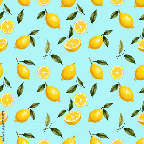 © Tatyana, Obraz premium Lemon pattern with leaves on light blue background
