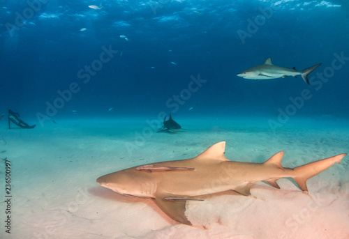Obraz premium Lemon shark and Caribbean reef sharks at the Bahamas