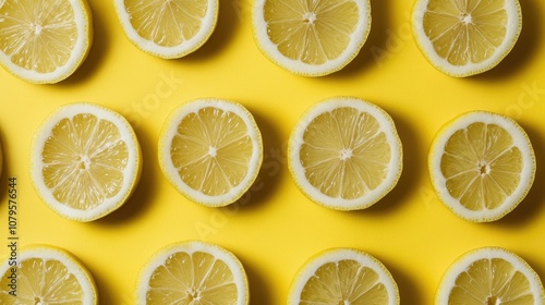 Fototapeta premium Lemon slices arranged horizontally on a vibrant yellow backdrop