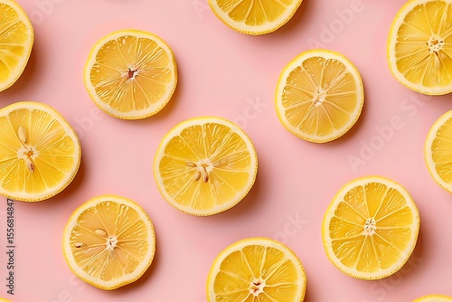 © maryatin, Fototapeta premium Lemon slices with pink background pattern.