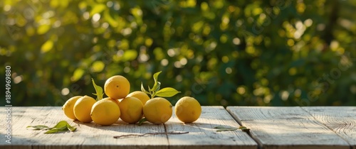 © AbstractAI, Obraz premium Lemons and green trees in garden with white wooden table