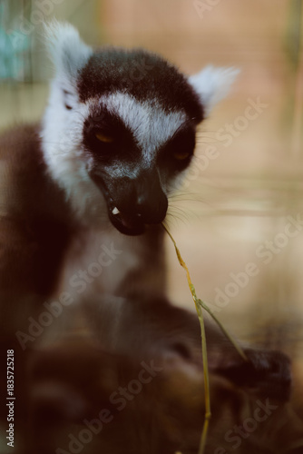Fototapeta premium Lemur animal wildlife portrait closeup face showing a ringtailed lemur nibbling a thin twig, soft fur detail, expressive eyes and whiskers in warm natural light with shallow focus.