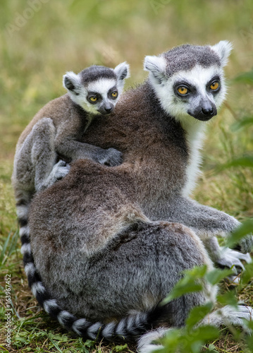 © milanvachal, Obraz premium Lemur catta baby on the mother's back/Lemur catta baby and mother/Lemur Catta