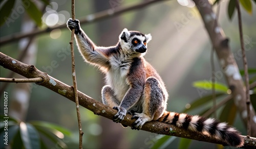 Fototapeta premium Lemur climbing a branch in a sunlit rainforest during the early morning hours