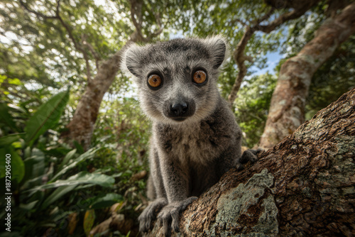 Fototapeta premium Lemur climbing a tree in a forest during daylight showing curiosity and...