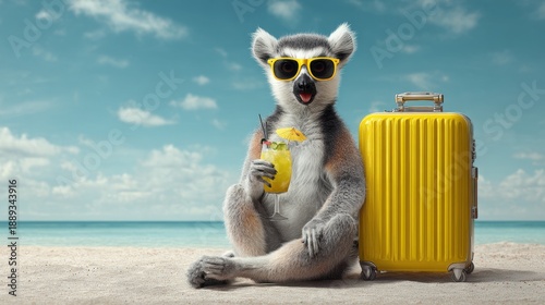 © ActionGP, Fototapeta premium Lemur on sunny beach with yellow suitcase and cocktail enjoying vacation vibes
