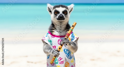 © Adek, Obraz premium Lemur on the beach playing flute with a colorful shirt.