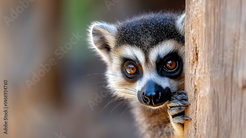 © Arjif, Obraz premium Lemur Peeking From Wooden Structure, Close-up Wildlife Animal