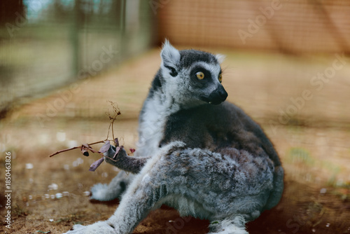 © SHOTPRIME STUDIO, Fototapeta premium Lemur primate animal wildlife sitting portrait with striking yellow eyes and bushy tail on ground, closeup of fur texture and alert pose in naturalistic enclosure setting.