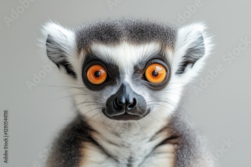 Fototapeta premium Lemur With Striking Orange Eyes Gazes Into the Camera Against a Neutral Background