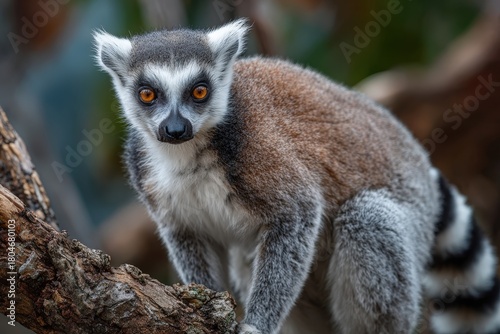 © Antony, Naklejka premium Lemur with striped tail perched on a branch during the golden hour