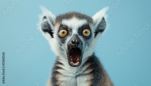 © DruZhi Art, Fototapeta premium Lemur with Wide Eyes and Open Mouth Against Light Blue Background, Expressive and Alert