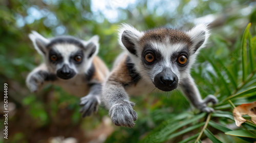 © Nataliya, Fototapeta premium Lemurs leaping between branches in Madagascar forest, curious eyes, Africa, lemurs, rainforest, wildlife, Madagascar, nature, primates, with copy space
