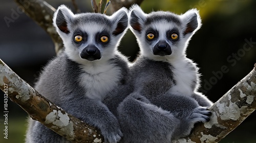 © V.Semeniuk, Fototapeta premium Lemurs Sitting on a Tree Branch in Madagascar During Daytime Observing Their Surroundings