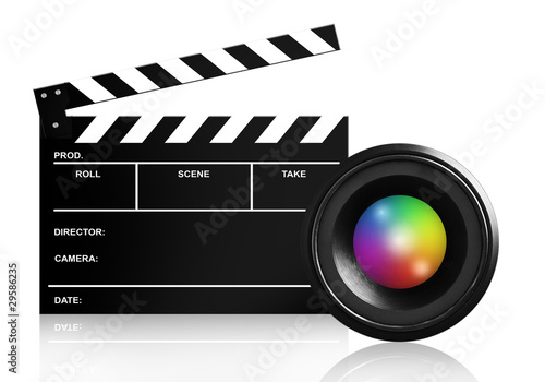 © Yuriy Kobets, Fototapeta premium lens & clap board on white