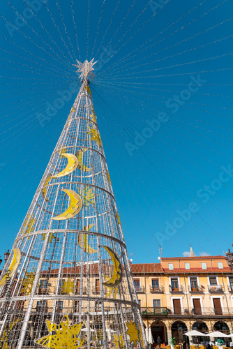 © alexemarcel, Fototapeta premium Leon, Spain - November 12 2022: Christmas tree in the city center of Leon in Plaza Mayor Square. Streets of Leon decorated with lights and ornaments in anticipation of the Christmas celebration.