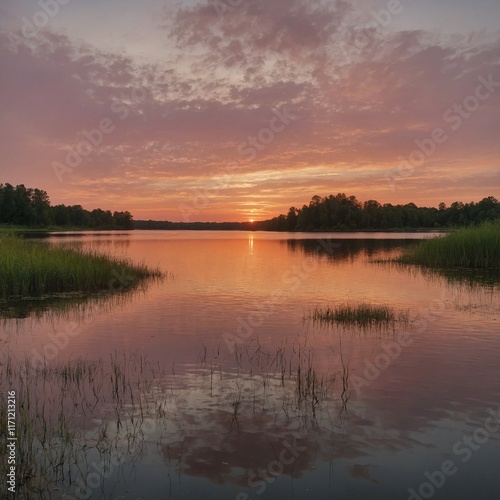 © Amjad, Fototapeta premium Leonardo_Kino_XL_Evening_Lake_Reflections_A_still_lake_mirrori_0