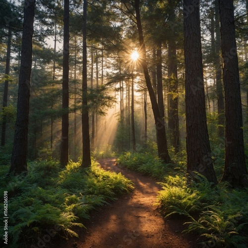 © Amjad, Obraz premium Leonardo_Kino_XL_Sunrise_Forest_Trail_A_winding_forest_trail_l_0