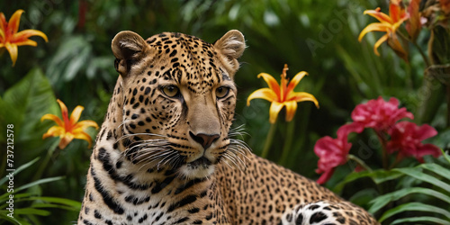 Naklejka premium Leopard against a background of tropical plants and flowers.