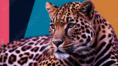 © Nikolai, Obraz premium Leopard animal abstract wallpaper. Contrast background panthera in vivid colors generative ai