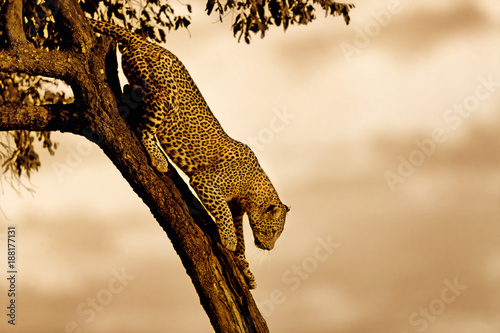 © maggymeyer, Obraz premium Leopard Bahati climbing down from the tree in Masai Mara, Kenya